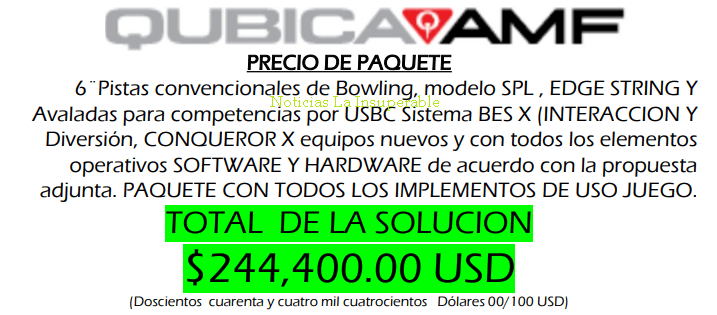 La misma se adjudicó a la firma” QUBICAAMF SUDAMERICANA S.A.S ( Colombia NIT 901 318 924-5) por la suma total de DÓLARES ESTADOUNIDENSES DOSCIENTOS CUARENTA Y CUATRO MIL CUATROCIENTOS (U$S 244.400.-).”