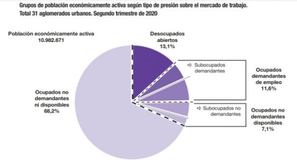 Con este nuevo registro, la tasa de desocupación subió 3,3 puntos porcentuales al pasar de 10,4% a 13,1% en el 2° trimestre de 2020 en relación al período previo, informó el Indec.
