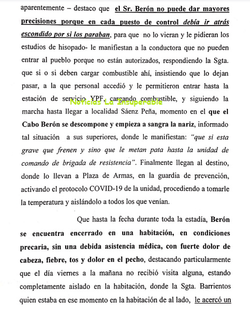 El cabo Cristian Alejandro Berón, de la Ciudad de Orán, Salta, miembro del Escuadrón Regimiento Monte 28 de Tartagal, fue llamado por sus superiores a presentarse en dicho escuadrón el miércoles 30 de septiembre pasado para tomarle muestra a través de un hisopado para Covid. El resultado tardarían unos días, pero sin ellos, al día siguiente recibió la orden de trasladarse hacia la ciudad de Resistencia -Chaco- a pesar de no contar con PCR negativo.
