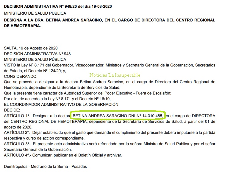 Saracino fue designada a través de la DECISIÓN ADMINISTRATIVA Nº 948 fechada el pasado 19 de agosto dentro del ministerio de Salud Pública provincial. El 8 de enero ya había conseguido el cargo de Directora por intermedio del memorándum Nº 02/2020, indican desde El Tribuno.