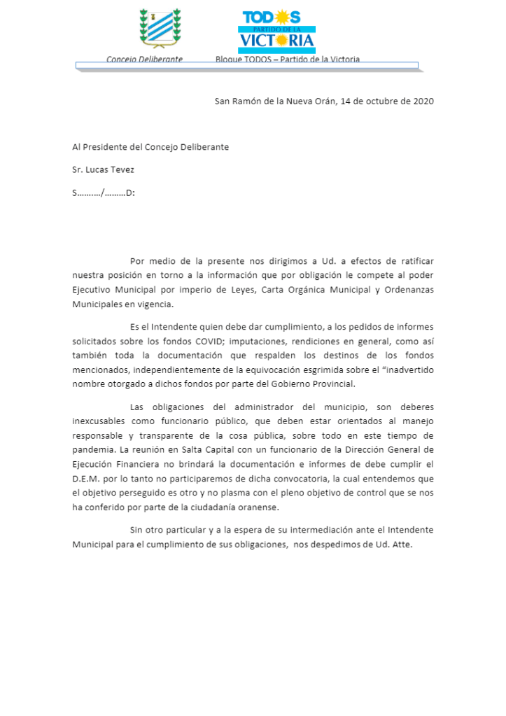 Es lamentable que en diversas oportunidades se niegue la posibilidad de traslado hacia Salta Capital a personas que requieren ser trasladadas por razones de salud y se utilice para otros fines que no tienen nada que ver con esta disposición del Ejecutivo Municipal de traslado a la Capital Salteña para una supuesta reunión aclaratoria de los Fondos Covid, cuando es claro que quien debe rendir informes y presentar documentación respaldatoria debe ser el municipio (facturas, ingresos, gastos etc.) , tal cual seguimos sosteniendo.