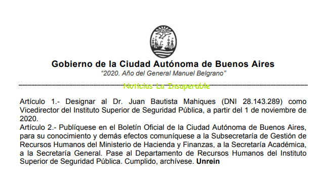 Mahíques fue nombrado a través de la RESOLUCIÓN N.º 209/ISSP/20 firmada por el Director Gabriel Unrein en reemplazo de Pablo Esteban Garcilazo. Curiosamente, en ningún lugar de la Resolución se indicaba que el nuevo puesto era “Ad Honorem”; tampoco se hacía mención a su condición de Fiscal General, por lo que (todo parece ser posible en tierras de Larreta) a su sueldo actual le sumaría el nuevo que equivale al 92% del sueldo básico del Jefe de la Policía Metropolitana.