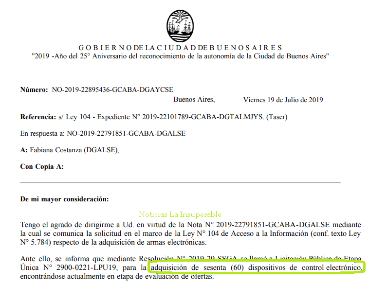 La misma lleva la firma del Subsecreatario de Gestión Administrativa Diego Pérez Lorgueilleux y se abonaran u$s 100.400,- a la firma Buccello y Asociados S.R.L., representante de Taser en Argentina.