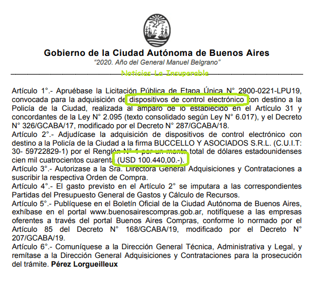 Tal como habíamos anticipado en exclusiva el pasado 17 de noviembre, cuando se confirmó la preadjudicación, finalmente se publicó en el día de hoy, en el Boletín Oficial porteño la RESOLUCIÓN N.º 275/SSGA/20 fecha en dos de diciembre, mediante la cual se aprueba “la Licitación Pública de Etapa Única N° 2900-0221-LPU19, convocada para la adquisición de dispositivos de control electrónico con destino a la Policía de la Ciudad”.