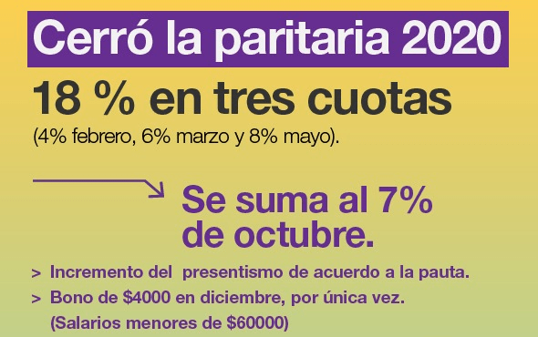 Así, los sindicatos acordaron un incremento del 18% para cerrar la paritaria del convenio colectivo de trabajo del empleo público, que se suma al 7 por ciento dispuesto en octubre último y, de esa forma, alcanza el 25%. Indicaron además que el aumento «será efectivo en tres cuotas (4% en febrero, 6% en marzo y 8% en mayo), a las que se sumará un bono de 4 mil pesos para fin de año para los salarios de hasta 60 mil pesos brutos.