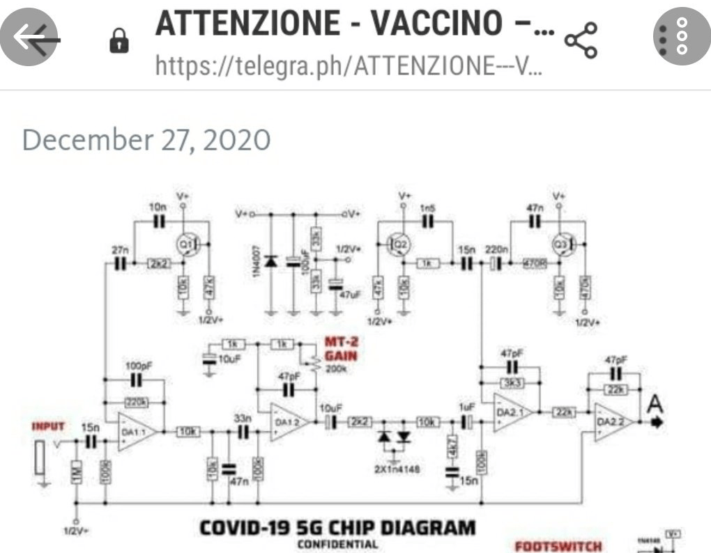 “Aquí en Italia, la gente empezó a compartir esta figura afirmando que es el diagrama del chip 5G que se ha insertado en la vacuna COVID”, dijo Fusco. «En realidad, es el circuito eléctrico de un pedal de guitarra«. De hecho, una mirada más cercana al esquema revela las etiquetas «Graves», «Agudos» y «Volumen», entre otros indicios de que este circuito, de hecho, no se colocará en el torrente sanguíneo al recibir la vacuna.