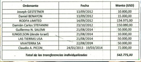 La lista se completa con los depósitos de Joseph Gestetner, por 10.800 dólares; Daniel Benayon (de la Comisión Directiva de la AMIA), por 15.000; Jorge Eduardo Iungelson (propietario de un hotel en Bariloche y casado con Silvana Daniela Garfunkel, de la familia de la madre del fiscal), por 10.000; Guillermo Nicolás Salimei (empresario), por 50.000 y Las Tierras USA, por 50.000 dólares. ¿A qué obedecieron todos estos movimientos? Hace años que la justicia debería haber dado una respuesta.