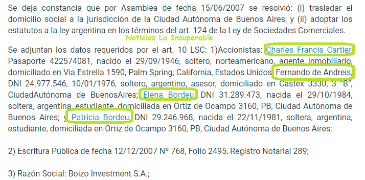 Charles Cartier, empresario norteamericano, es dueño de la también investigada Boizo Investments S.A., junto al propio Fernado de Andreis, y a Elena y Patricia Bordeu, hermanastras de Fernando y cuñadas de Mauricio Macri.