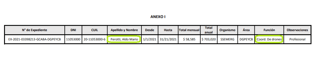 En en el año 2017 Horacio Rodríguez Larreta lo acogió en su seno y, a través de la RESOLUCIÓN N.° 29/SSEMERG/17 como Consultor en la Dirección General de Planeamiento de Emergencia y Coordinación de Bomberos dependiente de la Subsecretaria de Emergencias porteña. Allí, el comodoro Aldo Perotti, se dedica a la coordinación de Drones.