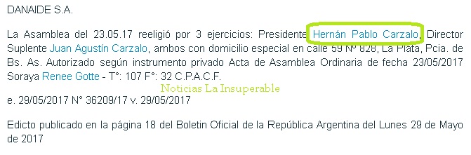 Presidente de Danaide S.A. es Hernán Pablo Carzalo.