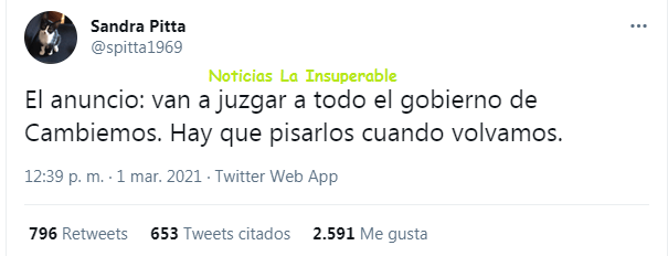 Al parecer, si nos son bolsas simulando cadáveres, son amenazas de muerte. Para la oposición, no parece caber otra respuesta que la violencia. Así lo demostró ahora Sandra Pitta, quien publicó un desagradable tuit en las redes: “El anuncio: van a juzgar a todo el gobierno de Cambiemos. Hay que pisarlos cuando volvamos”.