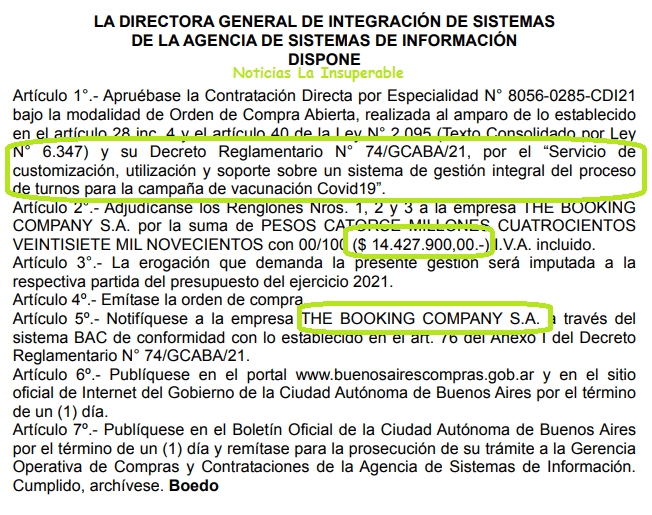 Dado esto, a través de la DISPOSICIÓN N.° 12/DGISIS/21, con firma de la Directora General Silvia Karina Boedo, se adjudicó la misma a través de una Contratación Directa por especialidad a la empresa The Booking Company S.A., por un precio de $ 14.427.900,00.-