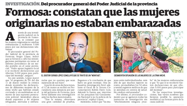 Pero, finalmente, todo resultó ser una mentira. El Procurador general de Formosa, Sergio López, y el fiscal Rubén Gon desmintieron a TN. Con testigos del barrio, entrevistas a los integrantes de las poblaciones originarias y con cifras oficiales de los gestantes en la zona, los funcionarios judiciales comprobaron que las mujeres denunciantes recibieron dinero para mentir a cámara y que las imágenes fueron grabadas en otro lugar.