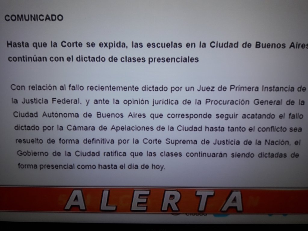 Dado esto, acaba de emitir un comunicado, en un claro delito de desobediencia, indicando que «continúan las clases presenciales» en la Ciudad, dada «la opinión jurídica de la Procuración General» porteña afirmando «que corresponde seguir acatando el fallo dictado por la Cámara de Apelaciones de la Ciudad» hasta que resuelvas la Corte Suprema.
