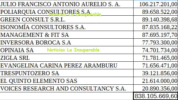 Trespuntozero S.A., que se lleva casi 40 millones, tal como mostraron desde El Disenso, es una empresa vinculada a empleados del Gobierno de la Ciudad. También está Voices Research And Consultancy S.A., dirigida por Constanza Cilley, otra de las favoritas del Diario La Nación.