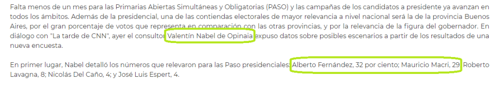 Tampoco podemos dejar de mencionar a la consultora Opinaia, aquella que dirige Valentín Nabel, quien en 2019 vislumbraba unas reñidísimas PASO con solamente 3 puntos de diferencia entre Macri y Fernández