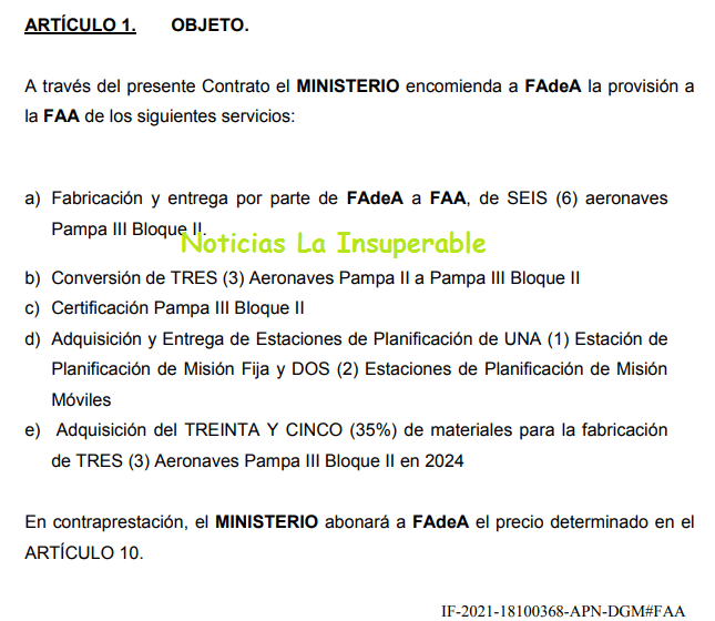 “Declárese SECRETO MILITAR, en los términos del Decreto N° 9390/63, por ser de carácter estrictamente técnico, la naturaleza de sus prestaciones y a su relación directa con la seguridad y defensa nacional, a los Anexos I, II, III y IV del contrato Interadministrativo para la PROVISIÓN DE AERONAVES PAMPA III PARA LA FUERZA AÉREA ARGENTINA, correspondiente al período 2021-2023, y a los Informes Técnico y Económico – Financiero referidos a dicho contrato”.