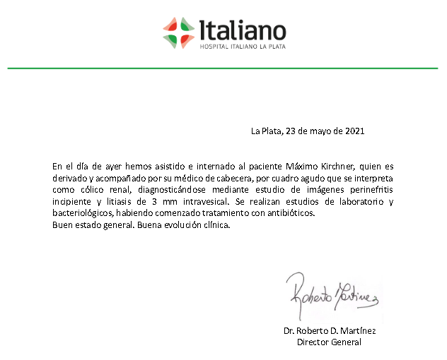 El diputado nacional Máximo Kirchner se encuentra internado en el Hospital Italiano de La Plata por un cuadro agudo que se interpreta como cólico renal. Su estado de salud es bueno y su evolución clínica es favorable, indicó el personal de salud del nosocomio.