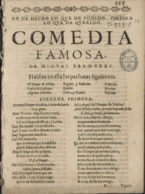 En los fondos de la BNE existen ejemplares de las ediciones conservadas de la obra – la ‘princeps‘, otra sin datos de imprenta y dos copias de esta impresas en Sevilla (sur de España) ya en el siglo XVIII- donde figura como autor Miguel Bermúdez, actor y escritor ocasional. Pero en realidad, la comedia pertenece a Lope de Vega, el mismo dramaturgo que solo unos meses después crearía ‘El castigo sin venganza‘, obra maestra del teatro universal.