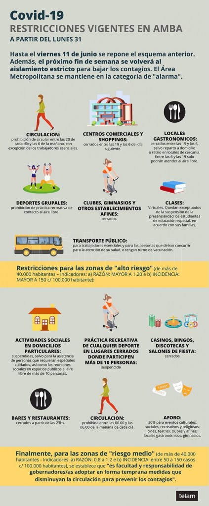 A partir del lunes 31, al menos en el Área Metropolitana Buenos Aires (AMBA) que se mantiene en la categoría de «alarma», las restricciones vigentes serán: