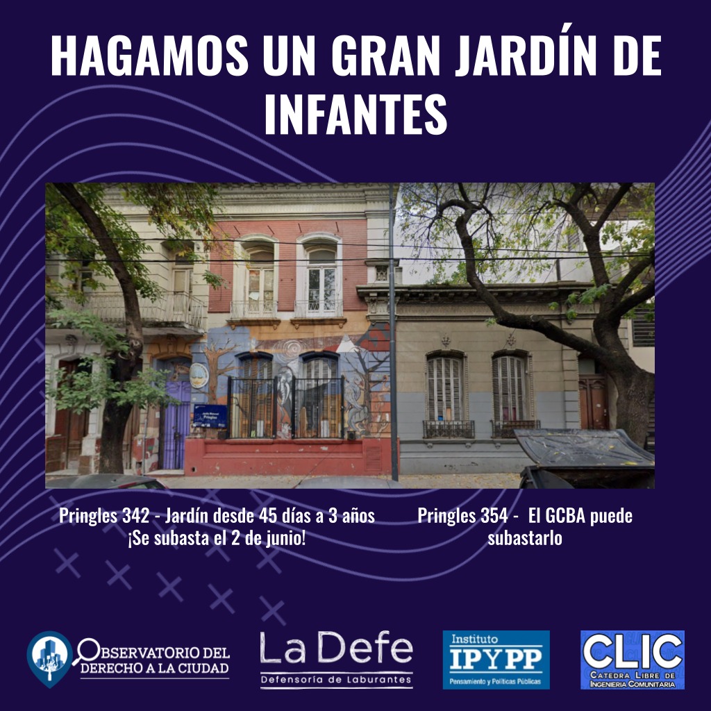 Entre esos inmuebles se encuentra el sito en la calle Pringles 354, lindero al jardín maternal Centro de Desarrollo Infantil (CEDI) sito en Pringles N° 340/42/44, cuya venta fue aprobada por la Ley N° 3.397. Este jardín maternal es uno de los pocos que admiten alumnas/os de 45 días a 3 años. En la Comuna N° 5 faltan 500 vacantes en ese rango etario.
