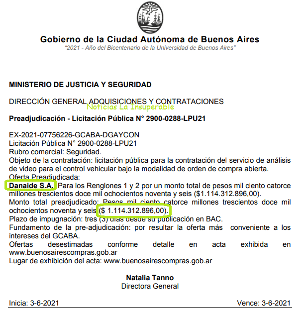 Por si fuera poco, hoy se conoció que, Danaide fue preadjudicada por la el Ministerio de Justicia y Seguridad porteño por la friolera de 1.114.312.896 pesos. ¿Para qué? Para llevar adelante el servicio de análisis de video para el control vehicular.