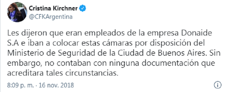 Ayer por la mañana dos personas sin identificación alguna intentaron colocar 3 cámaras y un domo en la esquina de mi casa, aquí en Buenos Aires. Personal de la policía federal que integra la custodia advirtió esta situación y les consultó qué tipo de tareas estaban realizando.