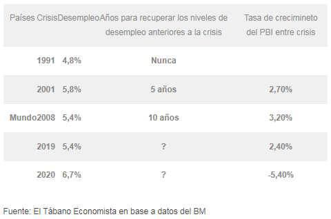 Como muestra el cuadro, las variables presentadas se fueron deteriorando en las últimas tres décadas. El crecimiento fue extremadamente lento, por debajo de lo esperado, el empleo nunca se recompuso a los niveles anteriores a las crisis o se tardó cada vez más para retomar el nivel anterior. Ahora, cuando se reposicionó, lo hizo con salarios menores, empleos más precarizados por las nuevas formas de contratación, dando como resultado una mayor concentración del ingreso.