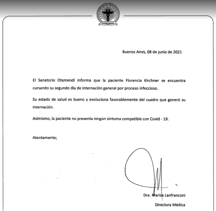 La hija de la vicepresidenta Cristina Kirchner se encuentra internad en el Sanatorio Otamendi. Desde dicha entidad indicaron que «la paciente Florencia Kirchner se encuentra cursando su segundo día de internación general por proceso infeccioso. Su estado de salud es bueno y evoluciona favorablemente del cuadro que generó su internación. Asimismo, la paciente no presenta ningún síntoma compatible con covid 19«, informa el parte que lleva la firma de la directora médica Marisa Lanfranconi.