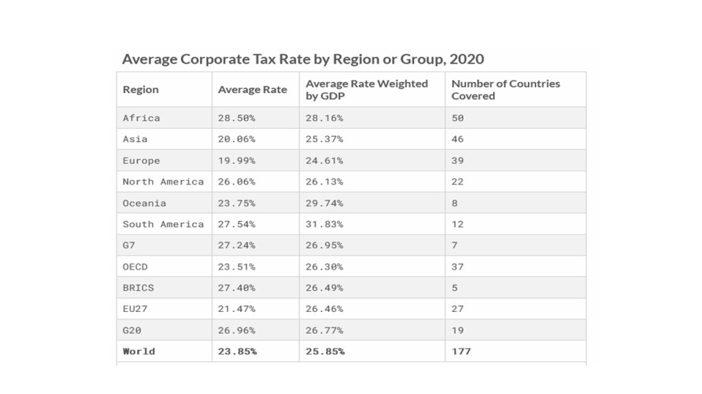 La idea es realmente alentadora, aunque el cuadro de Tax Fundation parece demostrar lo contrario: la tasa media mundial de impuestos a las compañías es del 25.85%, más de 10 puntos por encima de lo propuesto como mínimo. O sea, cien de las 223 jurisdicciones encuestadas para el año 2020 tienen tasas impositivas corporativas por debajo del 25% y 117 tienen tasas impositivas superiores al 20%, iguales o inferiores al 30%.