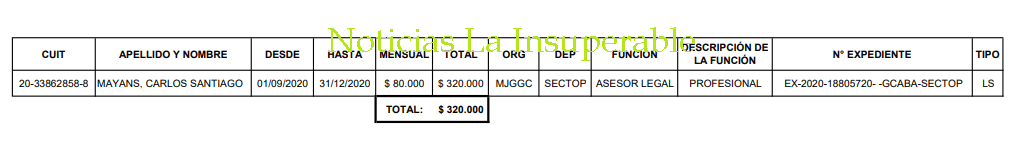 Larreta, a través de la RESOLUCIÓN N.º 400/SECTOP/20, le consiguió así una changa como “Asesor Legal” en la Secretaría Transporte y Obras Públicas de la Ciudad con un sueldo de $80.000.-