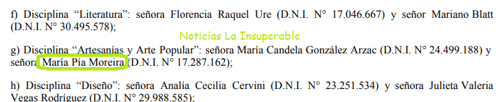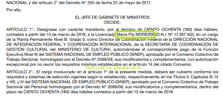 María Pía, Licenciada en Ciencias Políticas de la UCA, hizo sus primeras armas en el Estado de la mano del ex ministro de Cultura de la Nación hablo Avelluto, quien a poco de acceder a su cargo, en febrero de 2016, ya la nombraba a la mujer de Ceferino, a traés de la Decisión Administrativa 745/2016, (con la firma del inefable Marcos Peña) “en un cargo de la Planta Permanente Nivel A, Grado 0, del SINEP, de Directora Nacional de la DIRECCIÓN NACIONAL DE ACCIÓN FEDERAL de la ex SECRETARÍA DE POLÍTICAS SOCIO – CULTURALES, actualmente dependiente de la SUBSECRETARÍA DE COOPERACIÓN CULTURAL de la SECRETARÍA DE INTEGRACIÓN FEDERAL Y COOPERACIÓN INTERNACIONAL del MINISTERIO DE CULTURA”