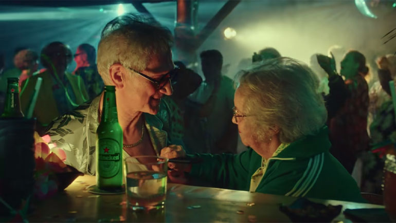 La música suena fuerte y en la pantalla se lee “la noche es joven”. La cámara entra a un boliche con luces de colores, DJs y mucha gente. Quienes ríen, bailan, charlan en la barra, se maquillan frente al espejo del baño, brindan y corren a meterse al mar son viejas y viejos. Con la frase “la noche comienza para los vacunados, es hora de unirse a ellos” cierra este comercial de Heineken.