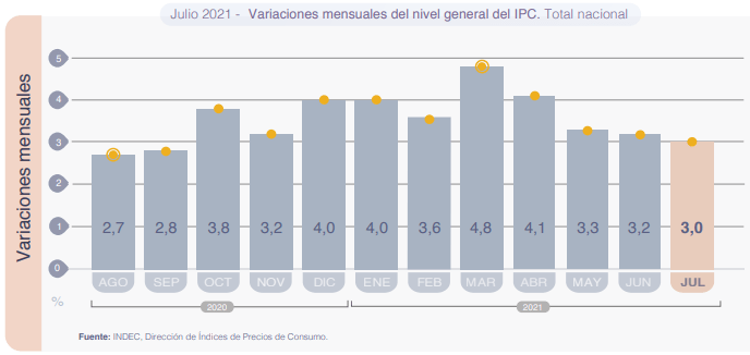 La inflación de julio fue del 3% en todo el país, indicaron este miércoles desde el Indec. El registro fue el cuarto consecutivo en baja desde el 4,8% de marzo pasado. Pero como los datos de inflación de este año superan a los de 2020, la suba de los precios en la medición anual sigue subiendo y entre julio de 2020 y julio pasado acumuló un 51,8%. En lo que va de 20201, la carestía ya acumula un 29,1%, con lo que alcanzó el nivel que el gobierno nacional previó en el Presupuesto de este año.