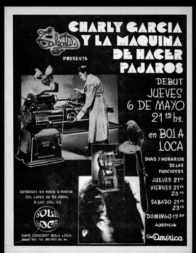 Allí, el 6 de mayo de 1976, debuta oficialmente “Charly García y La Máquina de hacer Pájaros”, que como es sabido, su nombre deviene de una historieta de Crist de aquellos tiempos que se llamaba, precisamente, «García y la Máquina de Hacer Pájaros»