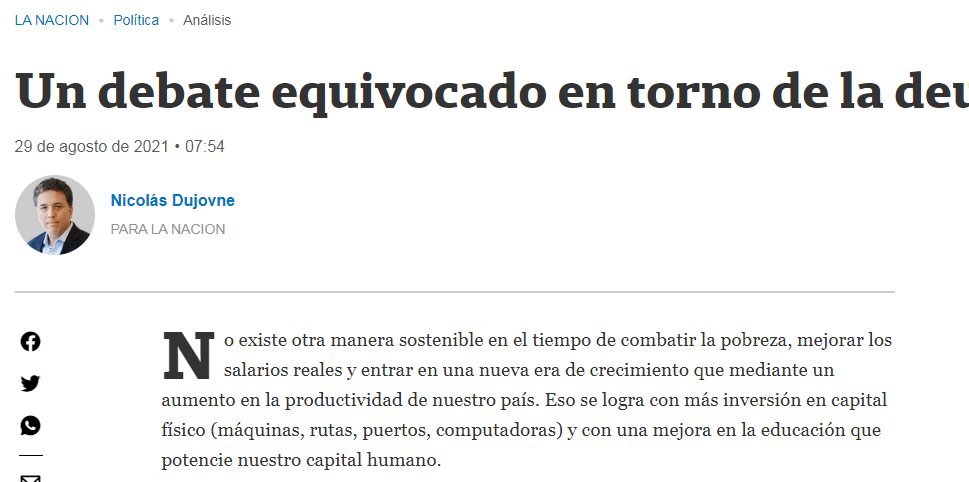 «Existe otra manera sostenible en el tiempo de combatir la pobreza, mejorar los salarios reales y entrar en una nueva era de crecimiento que mediante un aumento en la productividad de nuestro país. Eso se logra con más inversión en capital físico (…) La inversión depende de varios factores, pero el más relevante es el costo del capital«, detalla el funcionario que firmó el acuerdo con el FMI por el mayor préstamo que el organismo entregó a un país y que aumentó en 10 puntos los niveles de pobreza en la Argentina.