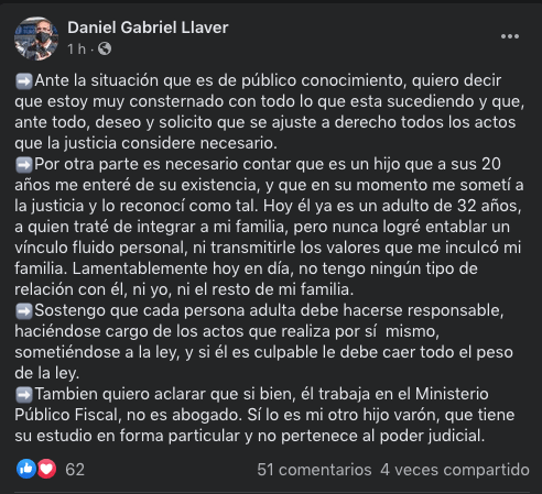 A través del posteo, el concejal se despegó de su hijo, lo que llamó la atención de los investigadores del caso: «Por otra parte es necesario contar que es un hijo que a sus 20 años me enteré de su existencia, y que en su momento me sometí a la Justicia y lo reconocí como tal. Hoy él ya es un adulto de 32 años, a quien traté de integrar a mi familia, pero nunca logré entablar un vínculo fluido personal, ni transmitirle los valores que me inculcó mi familia«.