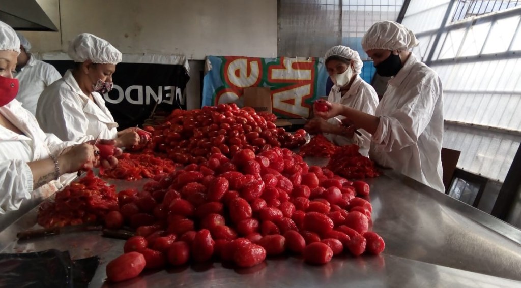Tradicionalmente, durante los meses de la cosecha las familias se reunían a procesar los tomates y conservarlos de manera natural, a fin de poder tener disponibilidad de ellos durante todo el año. En línea con esta idea, vecinas del barrio Aeroparque, en las afueras de la ciudad de Mendoza, decidieron estandarizar la producción para lograr un producto de calidad que no solo aporte valor a la producción primaria, sino que también se convierta en una fuente de trabajo sostenible que sea compatible con las otras tareas de cuidado que llevan adelante en sus hogares.