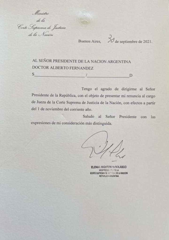 La jueza Elena Highton de Nolasco presentó su renuncia a la Corte Suprema en una carta fechada el pasado 30 de septiembre y enviada al presidente Alberto Fernández. La renuncia será efectiva a partir del 1 de noviembre próximo, de acuerdo con el texto que llegó a la Casa Rosada.
