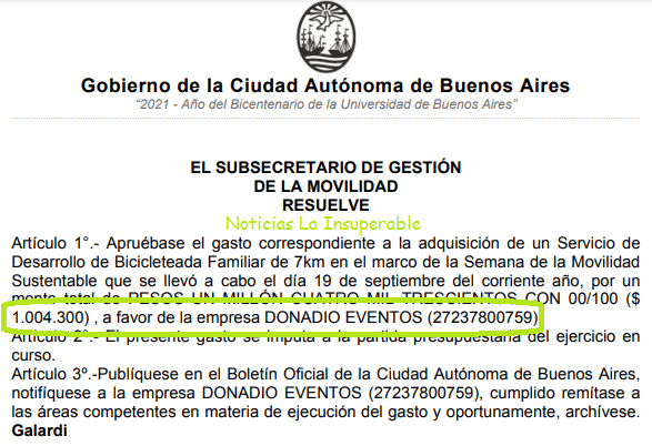 La contratación, en realidad, es a nombre de la exciclista y ahora empresaria Daniela Donadio, lo que no cambia el hecho, pero demuestra una vez más las desprolijidades a las que nos tiene sumidos el gobierno de CABA.