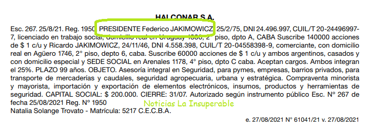 Jakimowicz, hace pocas semanas, el 25 de agosto, prestó su nombre para un proyecto privado de su esposa, fundando la empresa Halconar S.A., para prestar servicios de “Asesoría integral en Seguridad, para pymes, empresas, barrios privados, para transporte de mercaderías y caudales, seguridad agropecuaria, urbana y estratégica”. Allí figura también el suegro de Arietto, Ricardo Jakimowicz.