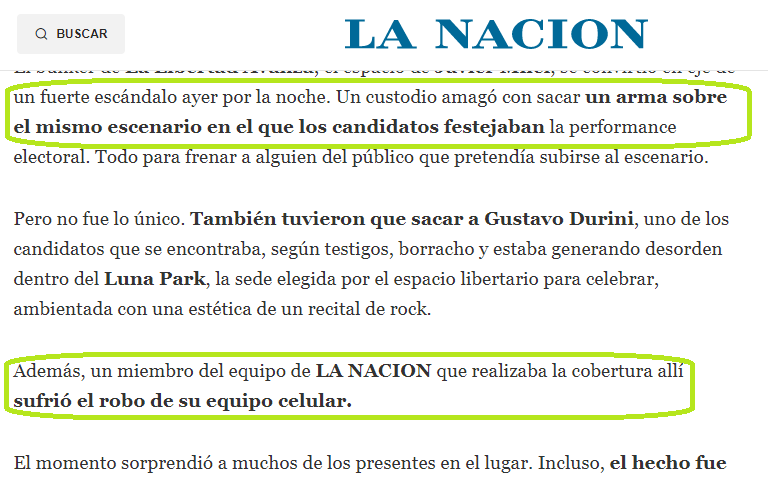 Un guardia armado, saliendo a un escenario mientras una diputada electa hablaba, amenazando con sacar su arma para dispararle a un simpatizante (dicen que era un integrante de la misma lista, Carlos Durini) que en su algarabía quiso subir a compartir el triunfo con los que estaban arriba es, sin dudas, un acto de una violencia a la que no debemos acostumbrarnos ni permitir desde ningún sector. Mucho menos la tibia explicación de los libertarios en un lavado comunicado que solo expresaba que “una persona del público quiso subirse al escenario mientras hablaba una candidata, por lo que intervino personal de seguridad para evitar que eso suceda. Uno de ellos se extralimitó y amagó con desenfundar un arma. La actitud, que repudiamos enérgicamente desde La Libertad Avanza, motivó la separación inmediata del hombre de seguridad en cuestión, quien fue retirado del Luna Park”.