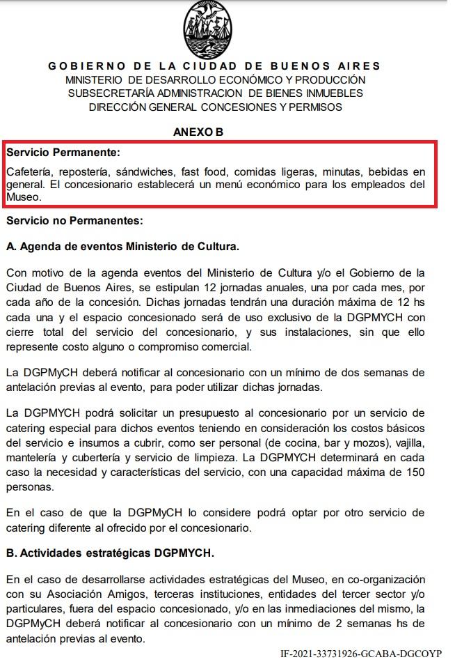 La documentación consultada indica que «el destino del espacio es para uso gastronómico.» Dando la especificación de que se consideraran dos tipos de servicios, un «Servicio Permanente de cafetería, repostería, fast food, sándwiches, comidas ligeras, minutas, bebidas en general» y un servicio donde «el concesionario establecerá un menú económico para los empleados del Museo.»