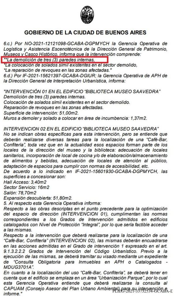 En el mismo Boletín Oficial se detalla la realización de dos importantes intervenciones. La número 1 que es indicada como «demolición de tres (3) paredes internas en el edificio «Biblioteca Museo Saavedra».