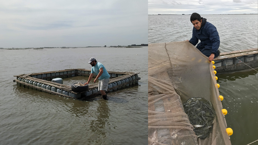“Las larvas son aportadas por la Estación Hidrobiológica de Chascomús, que también forma parte de este trabajo colaborativo. Pero antes de recibirlas, nuestra tarea es fabricar las jaulas e instalarlas en los cuerpos de agua en los que van a funcionar, en este caso la laguna Salada de Monasterio, en Lezama, y otras de la zona”, relata Javier Garcia de Souza, investigador del CONICET en el ILPLA y uno de los integrantes del equipo. Así, los diminutos individuos son introducidos en un espacio delimitado por una malla muy finita que evita su escape pero permite el intercambio de agua y la entrada de zooplancton, su alimento natural y lo único que comerán, ya que el sistema no incluye el uso de suplementos artificiales.