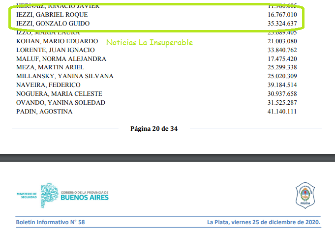 Gabriel Iezzi, aunque no figura en su CV, también es personal contratado del Ministerio de Seguridad Bonaerense. Allí fue designado por el entonces ministro de María Eugenia Vidal, Cristian Ritondo, para prestar servicios docentes en materia de Seguridad. Ritondo también contrato al hijo, el también abogado Gonzalo Iezzi. Serían los que «forman a las fuerzas…».