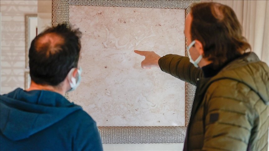 La piedra, que se extrajo como un bloque de un sitio de operación de mármol en el pueblo de Taşkesiği de Korkuteli, se llevó a la fábrica en la Zona Industrial Organizada de Antalya para su procesamiento. Los obreros, después de ver diferentes figuras sobre la superficie de mármol cortada y chapada, denunciaron la situación a las autoridades de la fábrica.