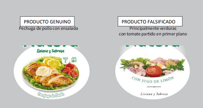 Según se informó, el principal elemento distintivo detectable a simple vista es que el frente del producto genuino presenta una imagen de una pechuga con rodajas de limón y tomate en la base de un plato, mientras que en el producto falsificado, la imagen central es medio tomate, rabanitos, huevo, camarón.