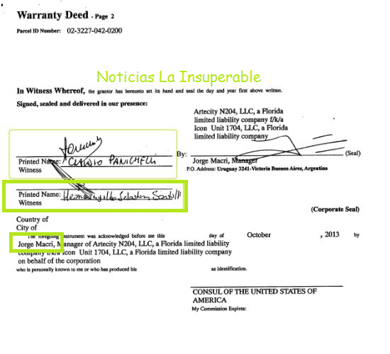 Tan de confianza es que, cuando Jorge Macri gestiona en Miami un préstamo ante la Mortgage Bankers Holding Corp. Inc., el 25 de noviembre de 2013, a través de su Offshore Artecity N204 LLC y rubrica una Escritura de Garantía Especial con St. Tropez II, LLC. Para la compra de la unidad 2-601 del condominio St. Tropez on the Bay II., el propio Hermenegildo Santilli ayuda con su firma.