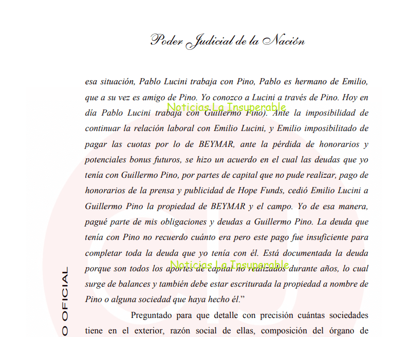 Blaksley (tal vez el más grande estafador de la historia argentina) declaró entonces: “…vino la situación de HOPE FUNDS, yo quede en deuda con LUCINI en honorarios y bonus, se fueron haciendo compensaciones y después un socio mío – Guillermo Pino – yo tenía una deuda con él (el manejaba mi prensa, los aportes de capital hacia Smilehood yo no pude continuar haciéndolos ante esa situación, Pablo Lucini trabaja con Pino, Pablo es hermano de Emilio, que a su vez es amigo de Pino. Yo conozco a Lucini a través de Pino. Hoy en día Pablo Lucini trabaja con Guillermo Pino). Ante la imposibilidad de continuar la relación laboral con Emilio Lucini, y Emilio imposibilitado de pagar las cuotas por lo de BEYMAR, ante la pérdida de honorarios y potenciales bonus futuros, se hizo un acuerdo en el cual las deudas que yo tenía con Guillermo Pino, por partes de capital que no pude realizar, pago de honorarios de la prensa y publicidad de Hope Funds, cedió Emilio Lucini a Guillermo Pino la propiedad de BEYMAR y el campo. Yo de esa manera, pagué parte de mis obligaciones y deudas a Guillermo Pino. La deuda que tenía con Pino no recuerdo cuánto era pero este pago fue insuficiente para completar toda la deuda que yo tenía con él. Está documentada la deuda porque son todos los aportes de capital no realizados durante años, lo cual surge de balances y también debe estar escriturada la propiedad a nombre de Pino o alguna sociedad que haya hecho él”.